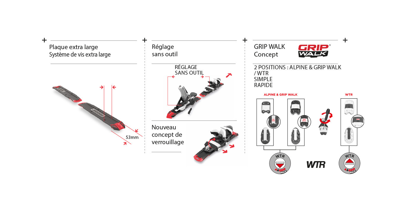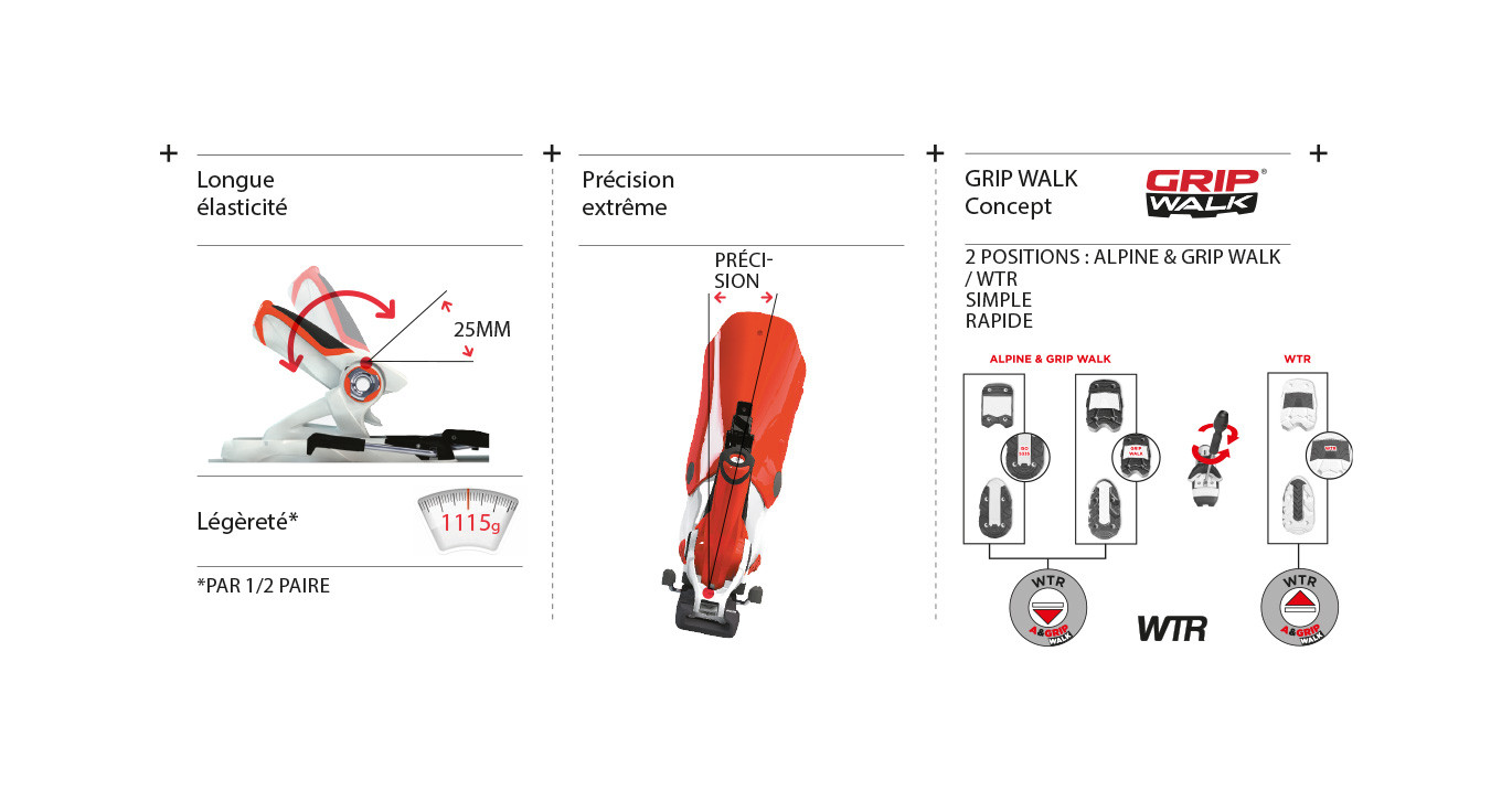 Une grande course élastique permet d’éviter au maximum les déclenchements intempestifs tout en respectant les valeurs de déclenchements des normes ISO internationales. Pour skier en sécurité et en toute confiance. Nous concevons des fixations plus légères pour que le matériel se fasse oublier au profit du plaisir de skier, sans aucune concession quant à la sécurité du skieur. Les fixations Dual s’adaptent en un simple tour de tournevis à deux types de chaussures : semelles Alpines ISO 5355 & GRIPWALK ou semelles de marche WTR (Walk To Ride).